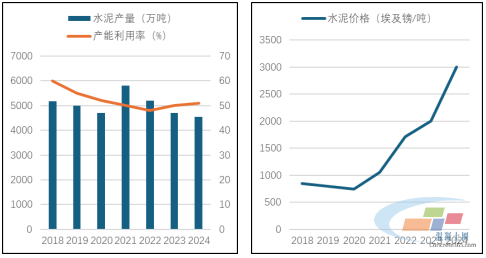 图1埃及水泥产量及利用率走势 图2埃及水泥价格走势